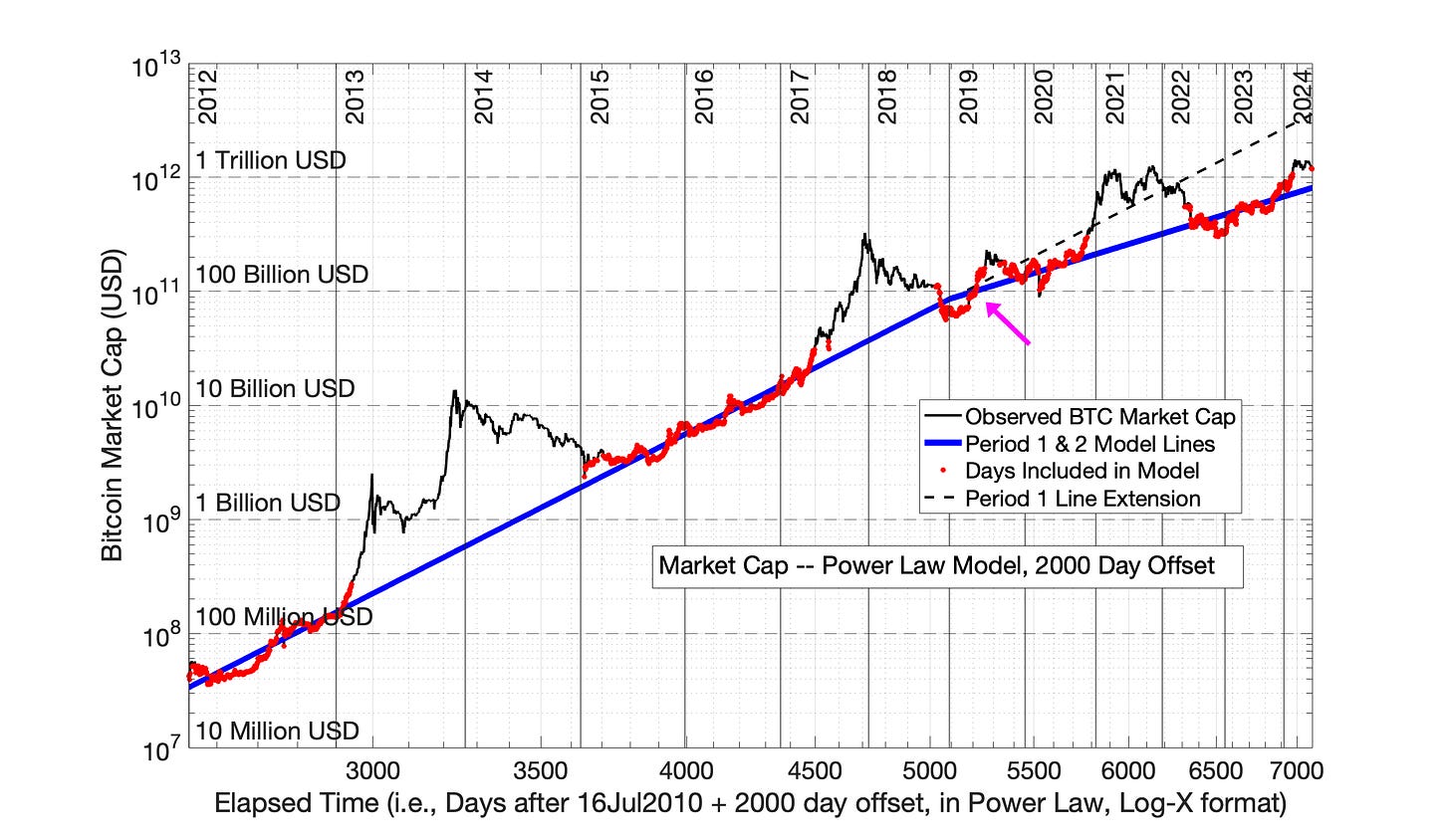 Fig 11.4 Power Law Model Plot (with 2000 day time offset) for Bitcoin Market Cap This figure was presented previously as Fig 9.9. The blue lines represent the least-squares, best-fitting, Power Law model straight lines for Periods 1 (01Jan2012 to 01Sep2018) and Period 2 (01Sep2018 to 01Jul2024. The dashed black line Is the linear extension of the Period 1 model fit, to visualize the extent of the adoption downshift that occurred in Period 2. The data points marked in red were included in the model fit. The magenta arrow points at the smooth transition between the Period 1 and 2 data achieved with a time offset of 2000 days. Details of determining the red data points and generating the linear model fit are described in the Appendix 1, Part 2 (Section 11.11.2). The R2 of the model fits are 0.994 and 0.933, for Periods 1 and 2, respectively.