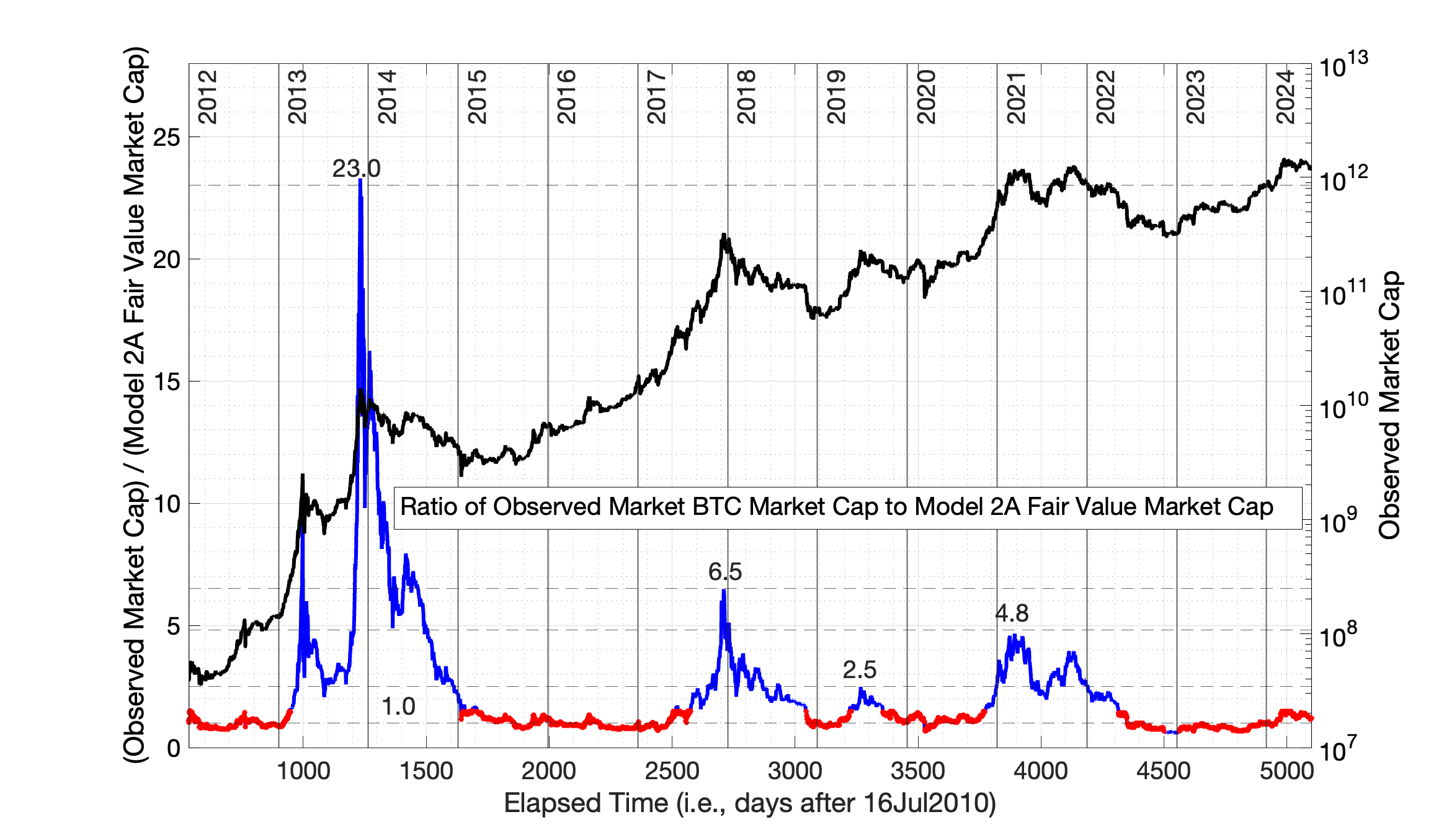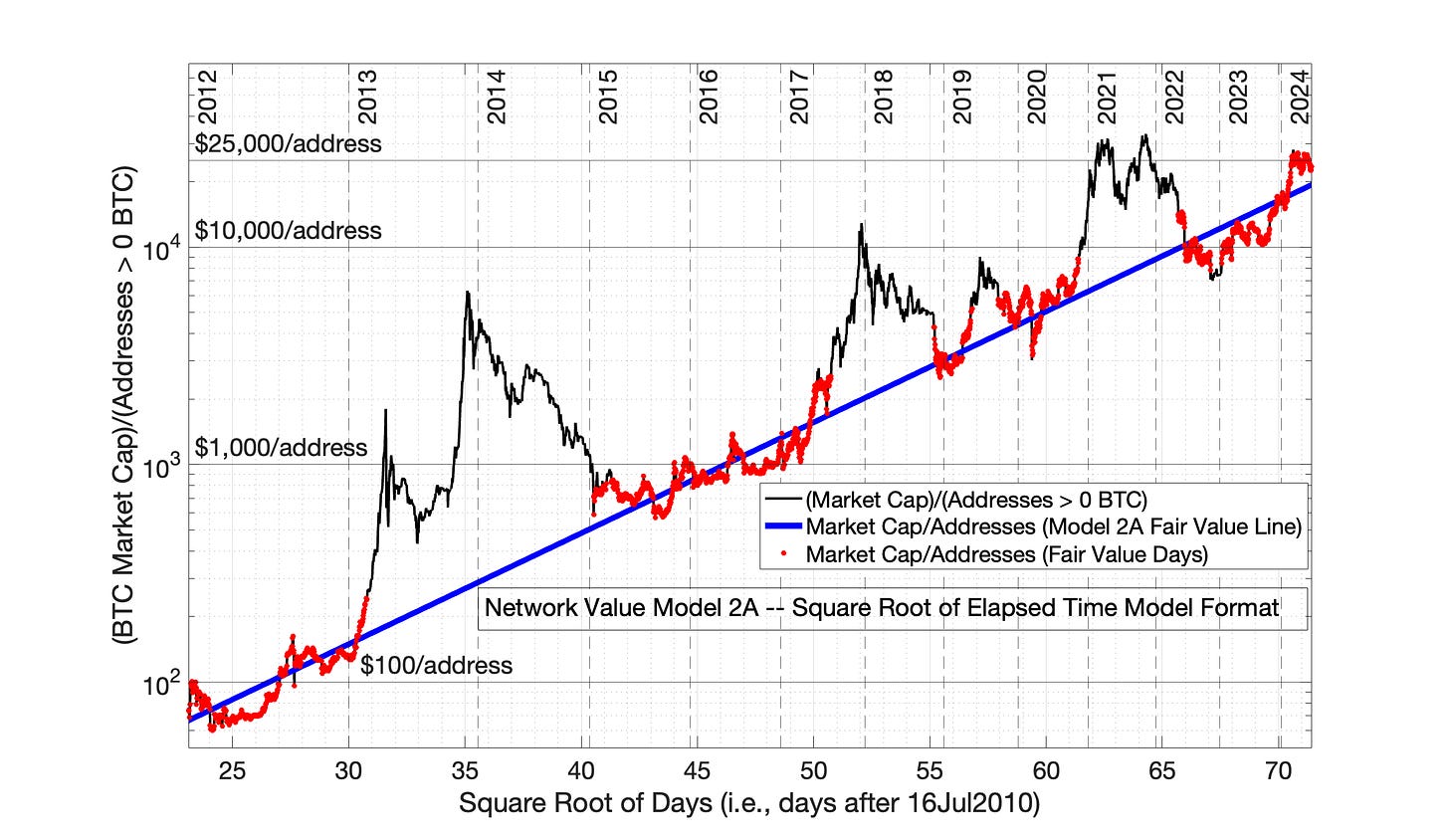 The red, “fair value” points are the data points included in the linear fit to generate the blue, “fair value” straight line. For the reasons stated previously, it is appropriate to only use data for the periods between Bitcoin “bull runs” for a network value model. Criteria and methodology for choosing the red data points and generating the blue line are described in Appendix 1, Part 2 (Section 11.11.2). The blue, straight line in Fig 11.5 has the formula