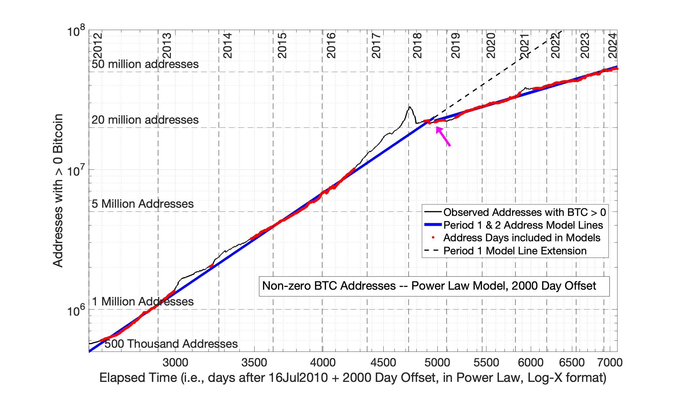 Fig 11.3 Power Law Model Plot (with 2000 day time offset) for Bitcoin-Containing Addresses This figure was presented previously as Fig 8.9. The blue lines represent the least-squares, best-fitting, Power Law model straight lines for Periods 1 (01Jan2012 to 01Sep2018) and Period 2 (01Sep2018 to 01Jul2024. The dashed black line Is the linear extension of the Period 1 model fit, to visualize the extent of the adoption downshift that occurred in Period 2. The data points marked in red were included in the model fit. The magenta arrow points at the smooth transition between the Period 1 and 2 data achieved with a time offset of 2000 days. Details of determining the red data points and generating the linear model fit are described in the Appendix 1, Part 2 (Section 11.11.2). The R2 of the model fits are 0.999 and 0.994, for Periods 1 and 2, respectively.