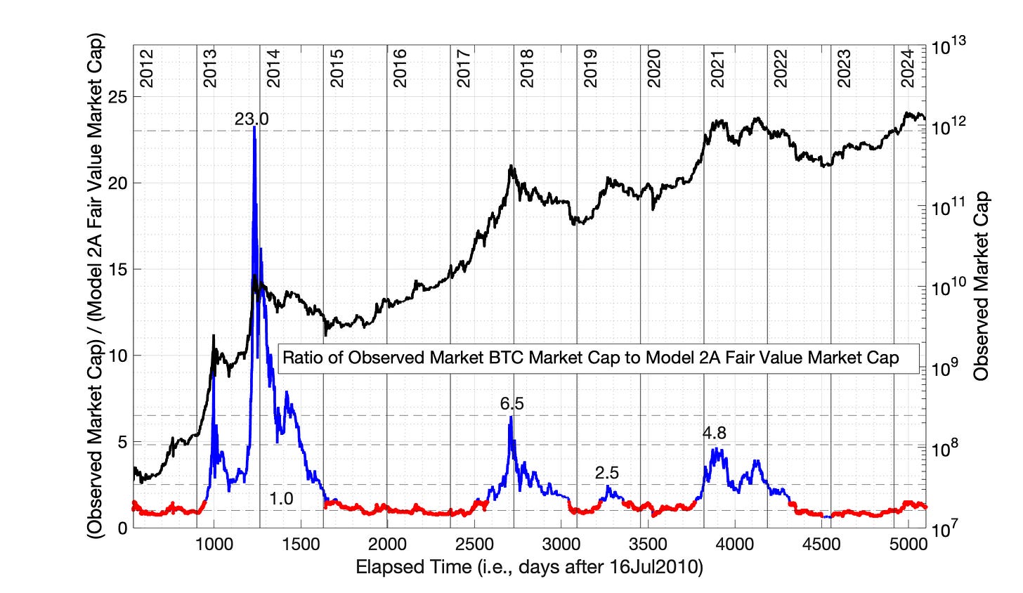Model 2 potentially provides an important new tool for understanding Bitcoin market cap fair value. For several years following the 2018 transition to a new adoption period, the SRET and Power Law models for fair value market cap for Period 2 were uncertain (Equations 11.2 and 11.4). The Period 1 equation was no longer accurate (as shown by the dashed line in Figures 11.2 and 11.4). Time was required for sufficient new data to emerge to define the slope and intercept of the Period 2 SRET and Power Law model equations.